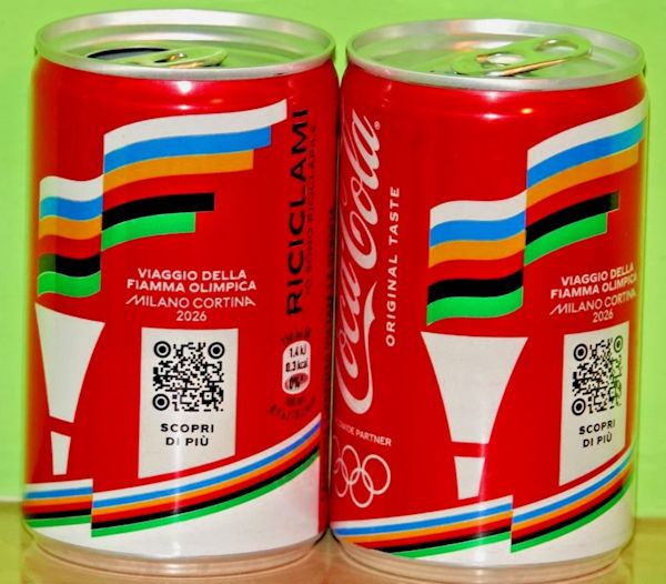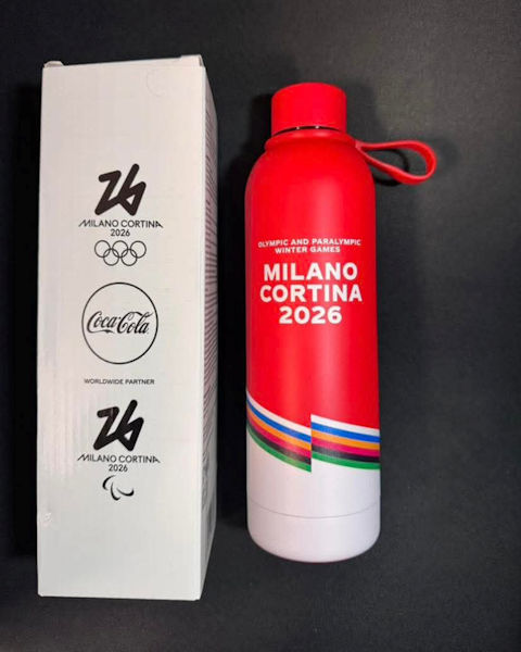 La dernière newsletter les annonçait mais cette fois ça y est c’est le grand jour ! Les JO d’hiver d’Italie commencent aujourd’hui (même si certains matchs ont commencé avant la cérémonie d’ouverture). Celle-ci a eu lieu hier soir dans quatre villes, mais la flamme olympique n’a été allumée qu’à Milan et à Cortina. Coca-Cola, en fidèle partenaire du mouvement olympique depuis a priori 104 ans, n’a pas raté l’occasion pour nous proposer des bouteilles, canettes, verres, pins et porte-clés et autres goodies, dont voici quelques photos.